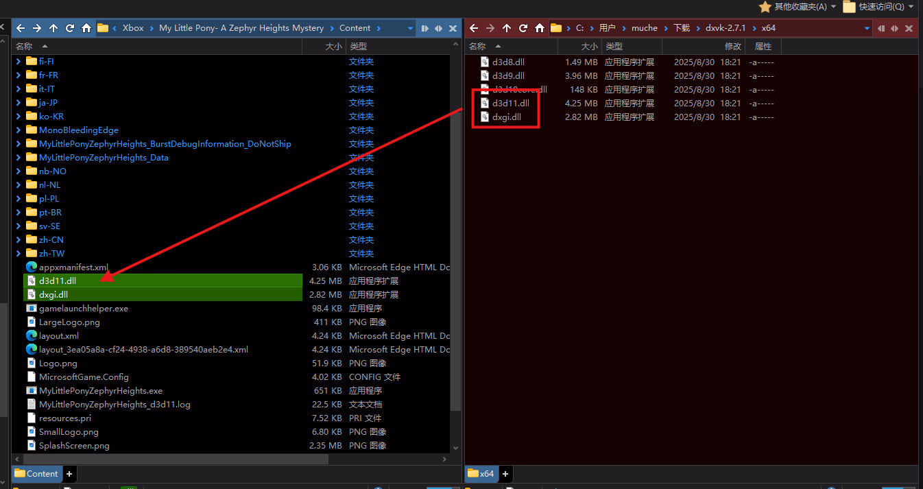 打开 My Little Pony- A Zephyr Heights Mystery\Content 文件夹,将 d3d11.dll 和 dxgi.dll 这两个文件放到这个 Content 目录里