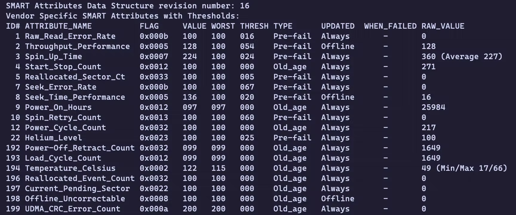 硬盘的 SMART 没有问题。这个盘要注意 Helium_Level,据说低于临界值 25 就会无法写入。氦气一旦泄露就会持续下降,所以务必要选择 100 的硬盘。